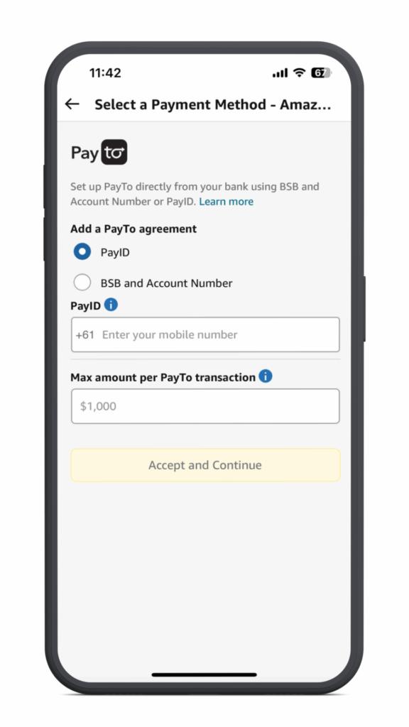 PayTo allows customers to pay straight from their bank account using a PayID (mobile number), or BSB and account number. Plus, a maximum transaction limit for each PayTo transaction is set up within the agreement (up to $1,000), providing more control to customers. Once a PayTo agreement has been authorised, one-click payments are then enabled for one-off and future purchases at amazon.com.au.