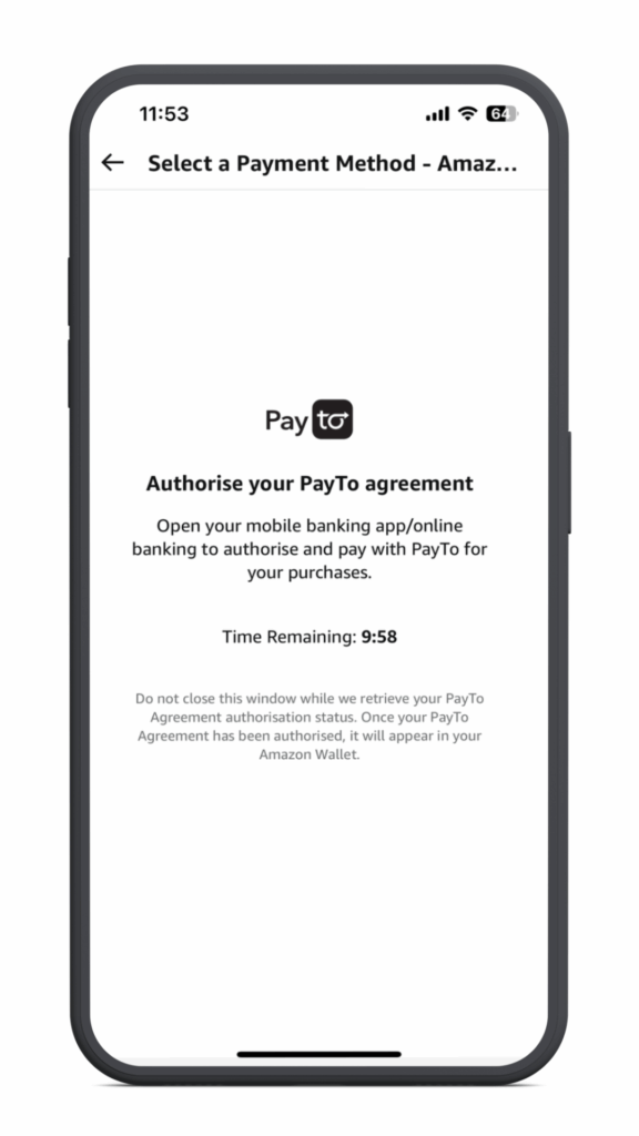 PayTo gives Amazon.com.au customers visibility and control over their payments by facilitating the safe authorisation of PayTo agreements via their online banking.